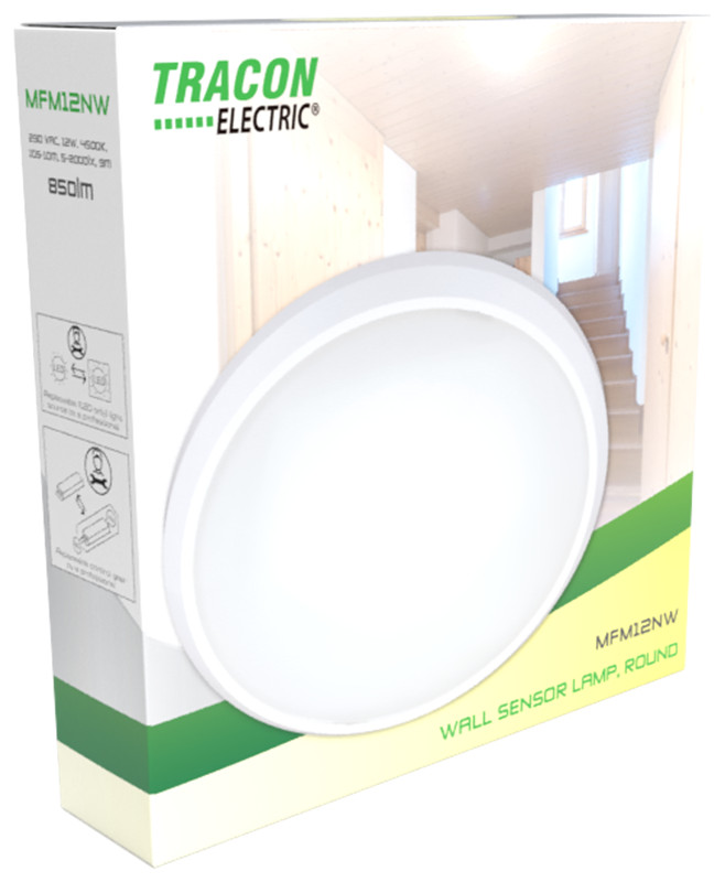 TRACON MFM12NW Mozgásérzékelős fali lámpatest, kerek forma 230 VAC, 12W, 850lm, 4500K, 10s-10m, 5-2000lx, 9m, EEI=F