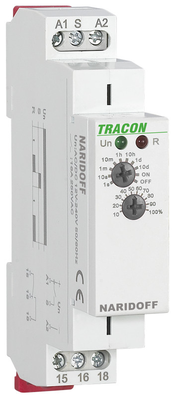 TRACON NARIDOFF Egyfunkciós (elengedéskésleltetéses) időrelé AC/DC 12-240V, 0,1s-10d, 16A/AC1, 250VAC/24VDC