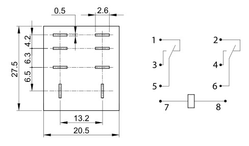 TRACON RL08-48DC Miniatűr teljesítmény relé 48V DC / 2×CO (10A, 230V AC / 28V DC)
