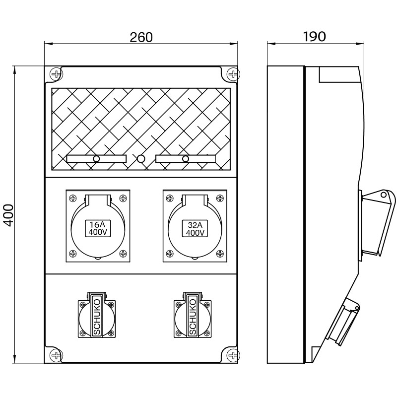TRACON TDB12-12M Csatlakozó doboz, védelem nélkül Out:2×SCHUKO+1×16A(3P+N+E)+1×32A(3P+N+E)