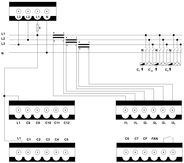 TRACON TFJA-03 Fázisjavító automatika, háromfázisú, 7 kondenzátor telephez 144×144mm