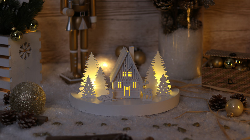 Tracon CHRWHW6WW LED karácsonyi házikó, fa, fehér, elemes Timer 6+18h,6LED, 3000K, 3xAA