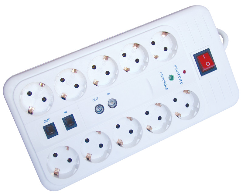 TRACON HNKTM10-3M-KT Négyzetes10-es elosztó kapcsolóval+túlfesz+ túláram+koax+tel 10×SCHUKO, 3m, max.16A, 250VAC, 3680W, H05VV-F általános leírása: