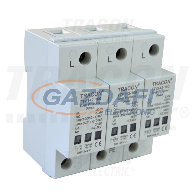 TRACON TTV1-2-100-3P AC/DC túlfeszültség levezető, 1+2-es típus, egybeépített