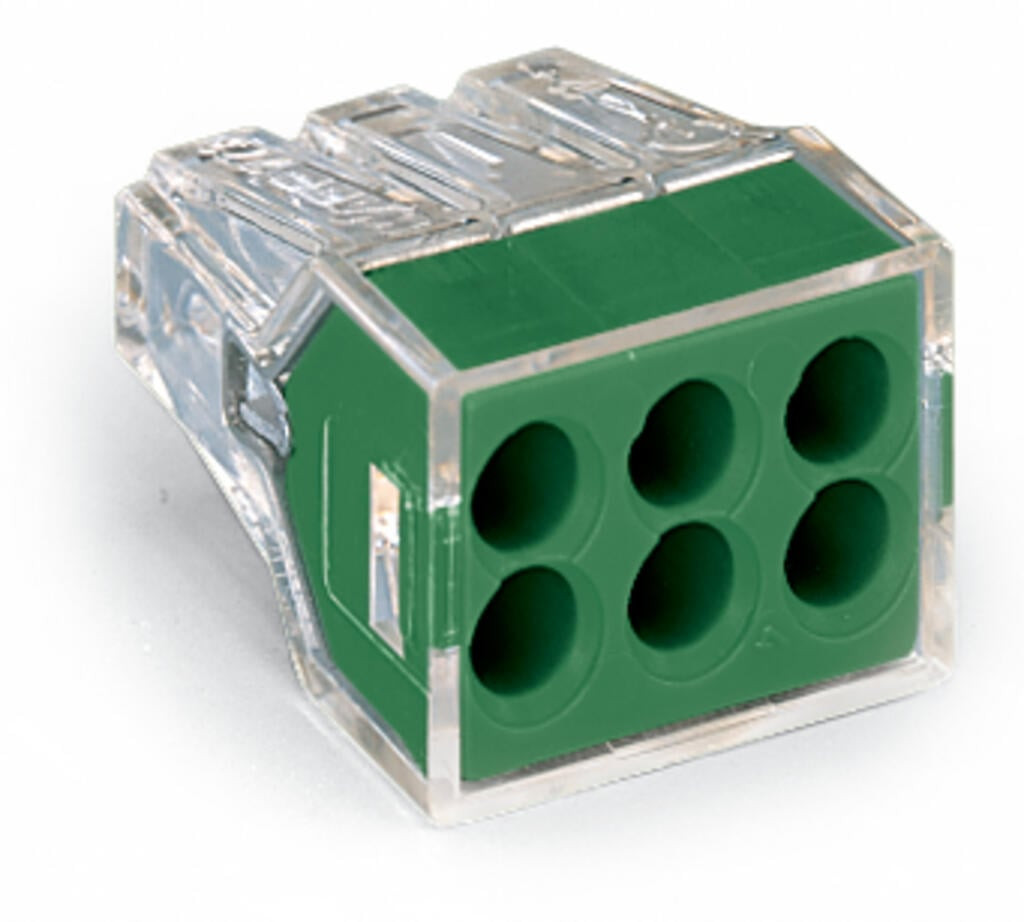 Wago 773-116 PUSH WIRE® csatlakozó kötődobozokhoz; tömör és sodrott vezetékekhez; max. 2,5 mm²; 6 vezeték; áttetsző készülékház; zöld fedél