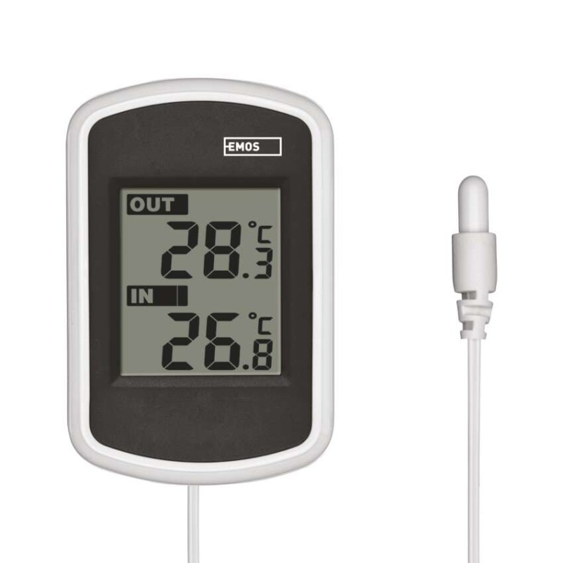 Vezetékes hőmérő a beltéri és kültéri hőmérséklet kijelzésével. A hőmérő 2 m hosszú vezetékes érzékelővel rendelkezik. Belső hőmérséklet: 0°C és +60°C. Külső hőmérséklet: -40°C és +60°C.