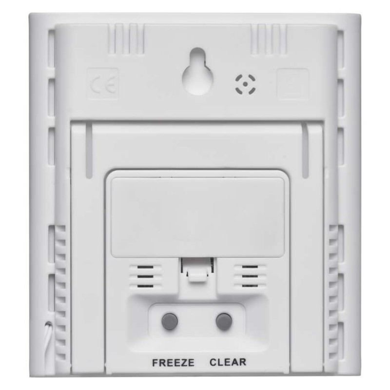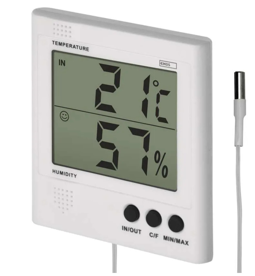 Digitális hőmérő vezetékes érzékelővel. A hőmérő menti a beltéri és kültéri hőmérsékletet, a beltéri páratartalmat, a legalacsonyabb és legmagasabb mért hőmérsékleti értéket, valamint figyelmeztet a fagyra. A hőmérő 2m hosszú érzékelővel rendelkezik. Belső hőmérséklet: -10 °C és +50 °C, felbontás 0,1 °C. Külső hőmérséklet: -50 °C és +70 °C, felbontás 0,1 °C.