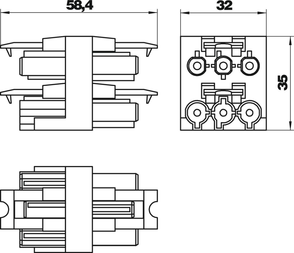 Elosztóblokk reteszeléssel, GST18i típus, 1 bemenet 3 pólusú csatlakozódugóval és 3 kimenet 3 pólusú csatlakozó hüvellyel.