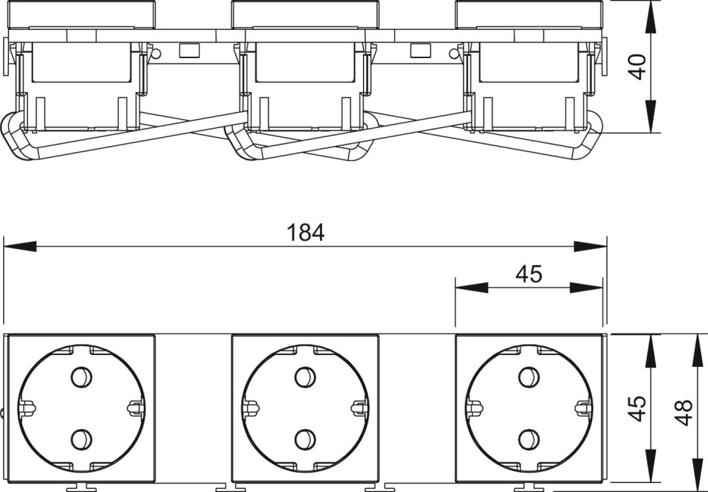 Előszerelt beépítőkeret 3 darab egyes védőérintkezős csatlakozóaljzattal MT45V modultartóba történő beépítéshez.