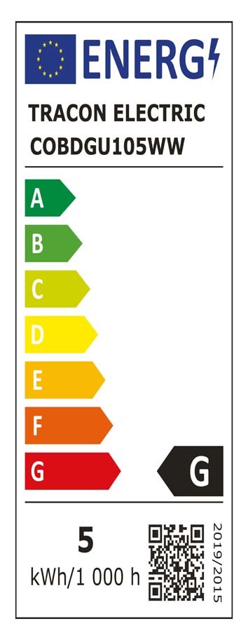 Manufacturer TRACONEnergy class A+Energiaosztály 2023- -Gyártói cikkszám COBDGU105WWSize 230VAC, 5 W, 2700 K, GU10, 350 lm, 40°Gyártó TRACONItem number COBDGU105WWStatus Last pieces