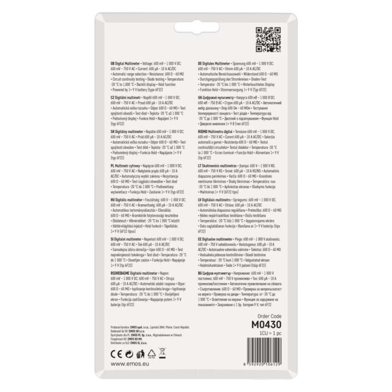 Manufacturer EMOSCsomagolás KartonFunkció MultiméterGyártói cikkszám 2202019000Hőmérséklet mérési pontosság -40 °C až +300 °CKijelző 5 3/4 digitSize 35 × 90 × 190 mmVoltage AC: 600 mV – 750 V, DC: 600 mV – 1 000 VSúly 528Szabványok IgenSzállítási Idő 2-7 munkanapSzármazási hely EUColor Szürke,kékTanusítványok és normák IgenTartozék akkumulátor, mérőcsúcsok, csökkentés tranzisztorok mérésére, hőmérséklet szonda típus KTermékosztálynak megfelelő IgenType EMOS M0430 multiméter MD-430Típusa M0430Világítás HáttérvilágításVonalkód / EAN-kód 8592920106129Letölthető tartalmak értékesítési csomagolás 1 db, bliszterméretek 35 × 90 × 190 mmtáplálás 1× 9 V (tartozék)hőmérsékletmérés -40 °C až +300 °CAC áram 600 µA–10 AAC feszültség 600 mV – 750 Va leolvasott értékek rögzítése igena max. érték rögzítése igenautomatikus kikapcsolás igenDC áram 600 µA–10 ADC feszültség 600 mV – 1 000 Vdióda tesztelése igenelektromos ellenállás 600 Ohm – 60 MOhmelem tesztelése nemérintési AC feszültség érzékelés nemérintés nélküli AC feszültség érzékelés nemháttérvilágítás igenkijelző megjelenítése 5 3/4 digitlakatfogó multiméter nemlemerülő elem jelzése igentartomány kiválasztása automatikus és manuálistranzisztor tesztelése igenvezeték folytonossága igenEMOS TERMÉKKATALÓGUS (2025/2026) EMOS ÚJDONSÁGOK KATALÓGUS (2025) EMOS KARÁCSONYI KATALÓGUS (2025) EMOS LIGHTING KATALÓGUS (2025/2026) EMOS GOSMART KATALÓGUS EMOS KERTÉSZETI TERMÉKEK KATALÓGUSA Gyártó EMOSItem number EMOSM0430