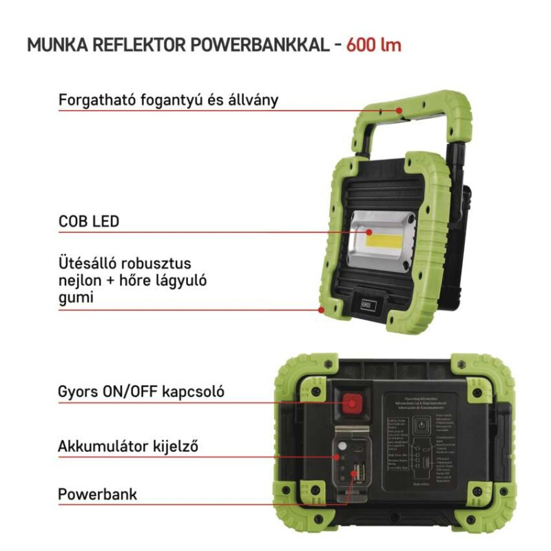 Manufacturer EMOSLuminous 600 lmGyártói cikkszám 1450000310Súly 535Color zöld, feketeType led lámpaVonalkód / EAN-kód 8592920077658Letölthető tartalmak értékesítési csomagolás 1 db, dobozméretek 172 × 45 × 126 mmtáplálás Li-Ion akupackakkumulátor típusa 3 000 mAh/3,7 Vanyag Nylon + TPRa töltés LED jelzése igenaz akkumulátor állapotának LED-es jelzése igenelem a csomag része igenfeltöltési idő 3,5 órafényáram COB LED 100 % – 600 lm, COB LED 50 % – 300 lmfókusz nemgarancia-időszak 2 évjellemzők forgatható fogantyúmárka EMOSmaximális fényárama 600 lmmax. világítási távolság 35 mspeciális funkciók akkumulátorvédelmi funkció, hordozható akku funkciótartozékok USB kábeltölthető igentöltőcsatlakozó típusa micro USB Büzemidő részletezés COB LED 100 % – 2,5 óra, COB LED 50 % – 3,5 óraüzemmódok COB LED 100 %, COB LED 50 %világítási idő 2,5–3,5 óravilágítási távolság COB LED 100 % – 35 m, COB LED 50 % – 25 mvilágítási üzemmódok száma 2vízálló igen (IP44)EMOS TERMÉKKATALÓGUS (2025/2026) EMOS ÚJDONSÁGOK KATALÓGUS (2025) EMOS KARÁCSONYI KATALÓGUS (2025) EMOS LIGHTING KATALÓGUS (2025/2026) EMOS GOSMART KATALÓGUS EMOS KERTÉSZETI TERMÉKEK KATALÓGUSA Gyártó EMOSItem number EMOSP4534