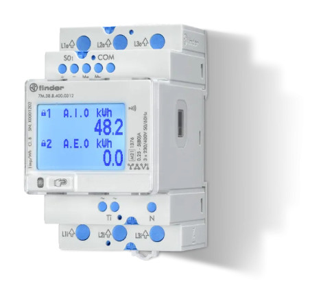 FINDER 7M.38.8.400.0112 Háromfázisú, kétirányú fogyasztásmérő, NFC-vel és LCD-mátrix kijelzővel