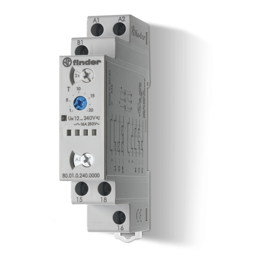 Többfunkciós időrelé, sorbaépíthető, 17,5 mm széles, 1 váltóérintkező 16 A / 250 V AC, érintkezőanyag: AgNi, funkciók: AI: meghúzás késleltetés, DI: bekapcsolással törlő, LI: szimmetrikus/aszimmetrikus ütemadó relé impulzusindítással, BE: ejtés késleltetés, CEb: meghúzás és ejtés késleltetés vezérlőkontaktussal, DE: bekapcsolással törlés vezérlőkontaktussal, LE: szimmetrikus/aszimmetrikus ütemadó relé, vezérlőkontaktussal, impulzusindítással időzítési tartomány: 0,1 s - 24 h, tápfeszültség: (12...240) V AC/DC (50/60 Hz), védettségi mód: IP 20, NFC-kommunikációval a Finder Toolbox applikáción keresztül konfigurálható