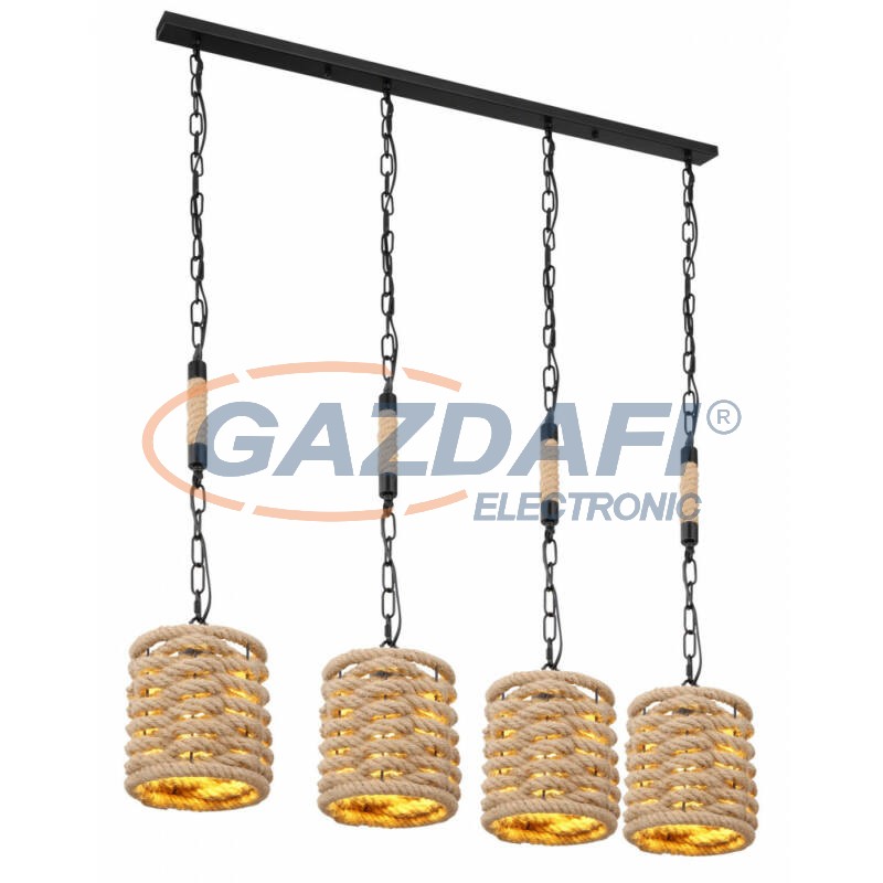 Függeszték fém fekete váz, fa gerenda, fekete fém drót búrák, barna kenderkötéllel körbefonva. HxSzxM: 1070x165x1500, fényforrás nélkül 4xE27 40W 230V