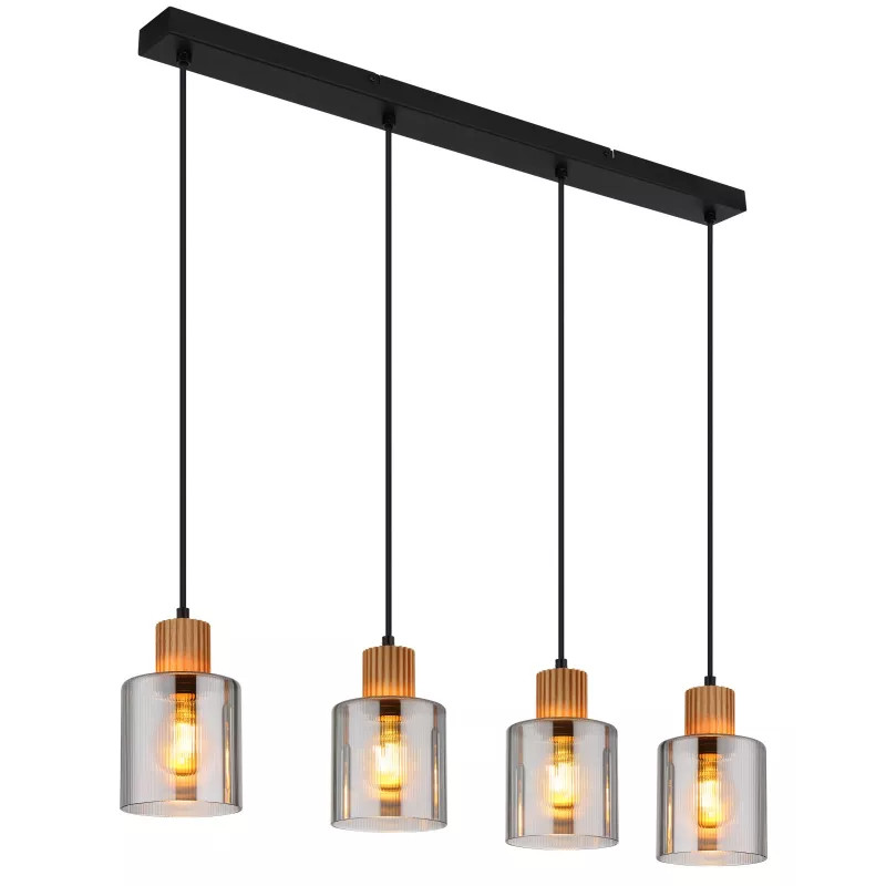 Függőlámpa, fekete matt fém, sötétbarna fa, füstszínű üveg, fekete PVC kábel, magassága rövidíthető, HxSzxM: 780x120x1200mm, 4x E27 25W 230V izzók nélkül