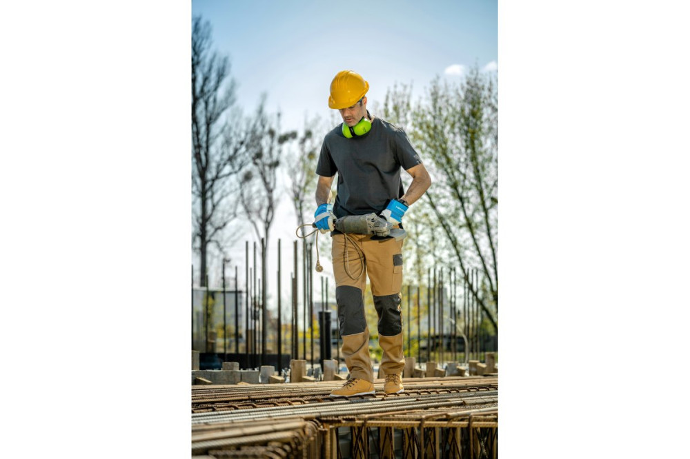 Gondosan elkészített bézs színű férfi védőnadrág. A kiváló minőségű anyagok és a szoros szövés biztosítja a tartósságot és a nagyfokú használati kényelmet. Egyéni védőfelszerelés – I. osztály. A nadrág megfelel az ergonómia, méretjelölés és ártalmatlanság szabványának – EN ISO 340.