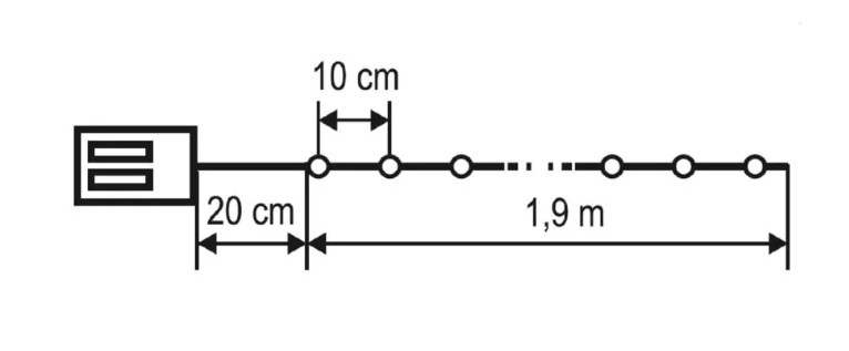 A fényesen ragyogó, pontszerű LED-ek 10 cm távolságra helyezkednek el egymástól, biztosítva, hogy a fények egyenletesen oszoljanak el a füzér teljes hosszán. A fényfüzér tápellátása 2 db 1,5 V-os (AA) elemmel történik, amely nem tartozék, de egyszerűen beszerezhető, így a füzér könnyedén elhelyezhető bárhol a lakásban, anélkül, hogy elektromos csatlakozóra lenne szükség.