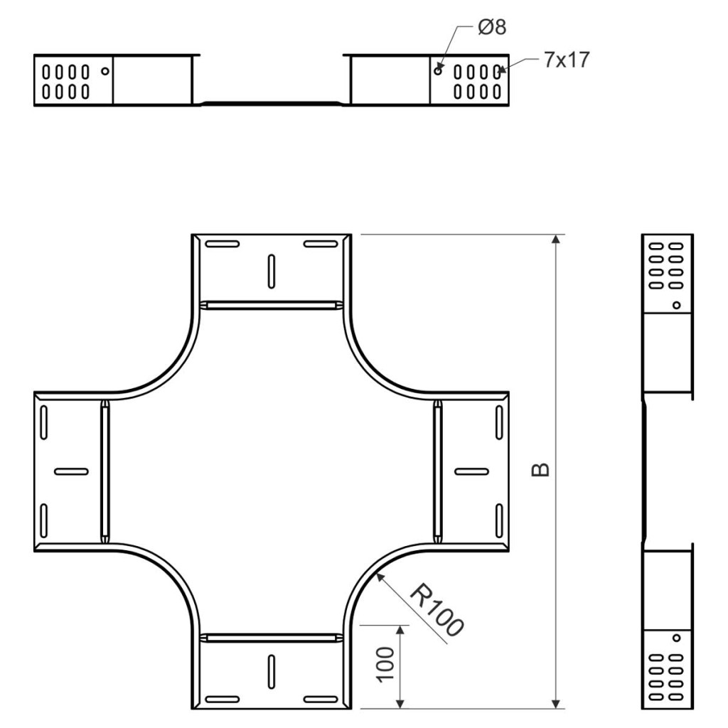 Cross for making traversing of 2 cable routes with dimension 110x150 mm, superficial treatment sendzimir. Connection with the cable tray can be done without using special connectors