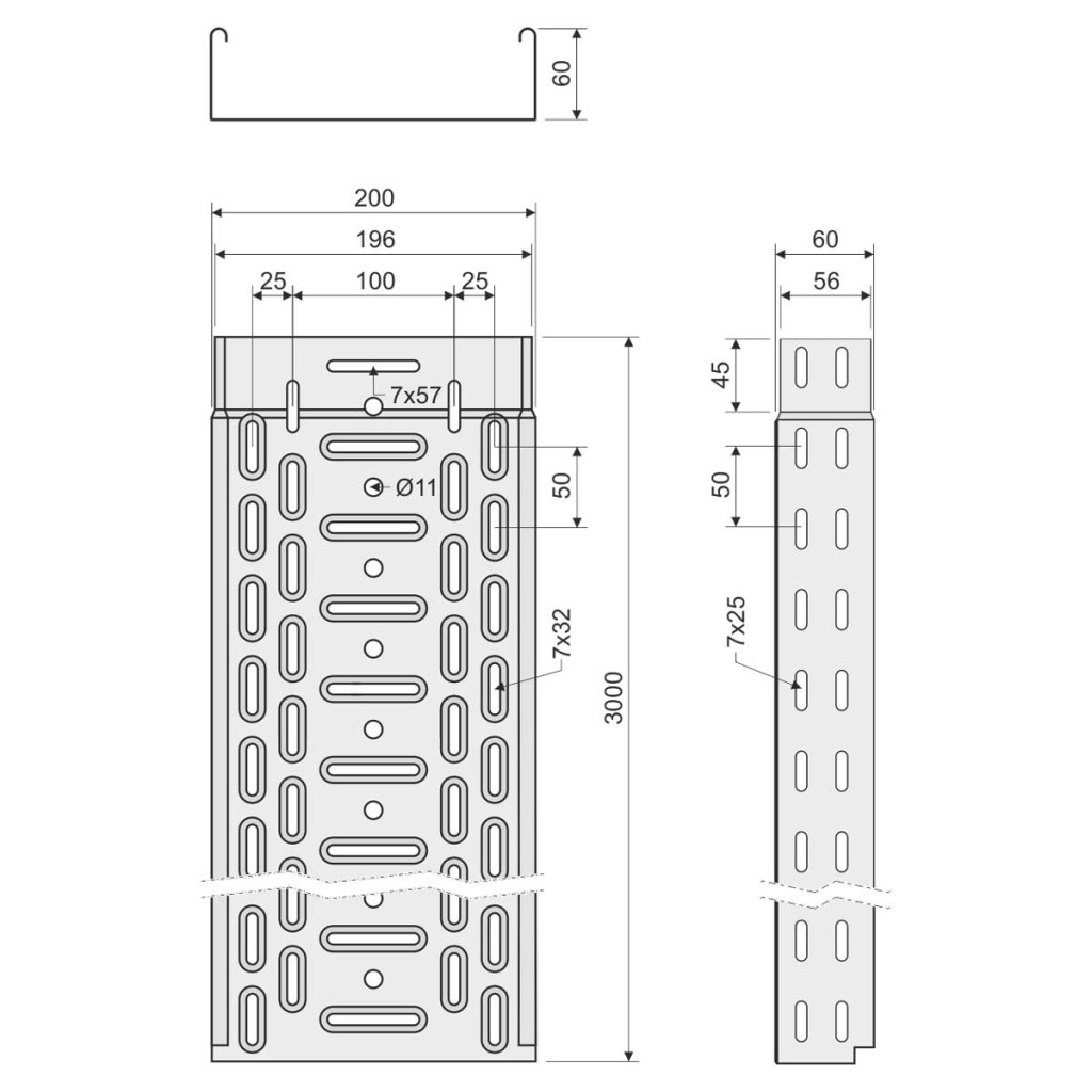 Cable tray KZ 60x200 from sheet 1,25 mm for connection by integrated coupling, superficial treatment sendzimir, perforated, with embosy for augmentation of firmness and rigidity, for systems which maintained functionality in fire