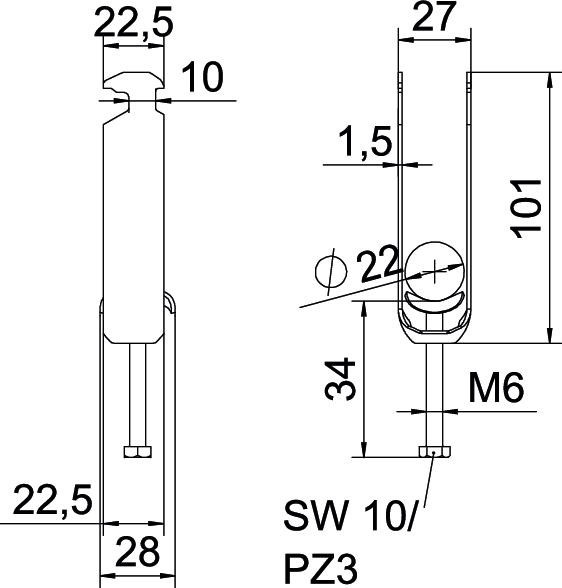 Kengyeles bilincs kalapácsfejes kivitel, a fém nyomóvályú legömbölyített peremmel rendelkezik, így nem kell tartani a kábel sérülésétől. Függőleges és vízszintes szereléshez 3 kábel részére C profilsínen. Résszélesség 16 - 17 mm. Egymenetes csavar a nyomóvályún, univerzális hatlapfejű csavarfej SW10/PZ3 kereszthoronnyal. Kültéri és beltéri szereléshez alkalmas. A kábeleket kettes nyomóvályúval el kell választani egymástól. Ellendarab használata ajánlott.