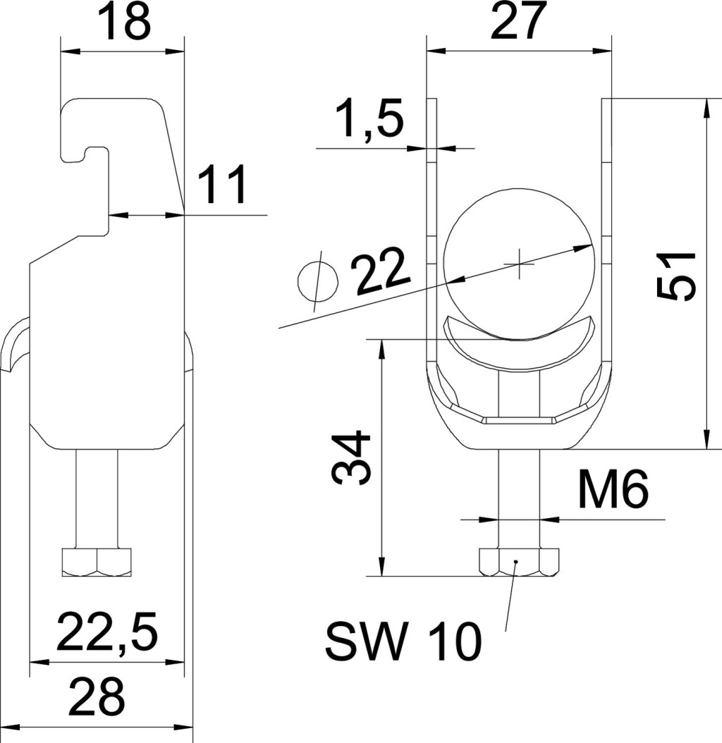Kengyeles bilincs U-kivitel, a fém nyomóvályú legömbölyített peremmel rendelkezik, így nem kell tartani a kábel sérülésétől. Függőleges és vízszintes szereléshez 1 kábel részére C profilsínen. Résszélesség 18 - 22 mm Egymenetes csavar a nyomóvályún, univerzális hatlapfejű csavarfej SW10/PZ3 kereszthoronnyal. Kültéri és beltéri szereléshez alkalmas. Ellendarab használata ajánlott.