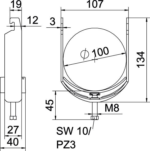 Kengyeles bilincs U-kivitel, polipropilén műanyag nyomóvályúval. Függőleges és vízszintes szereléshez 1 kábel részére C profilsínen. Résszélesség 18 - 22 mm Egymenetes csavar a nyomóvályún, univerzális hatlapfejű csavarfej SW10/PZ3 kereszthoronnyal. Kültéri és beltéri szereléshez alkalmas. Ellendarab használata ajánlott.