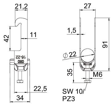 Kengyeles bilincs W-kivitel, polipropilén műanyag nyomóvályúval. Függőleges és vízszintes szereléshez 1 kábel részére, 40 mm oldalmagasságú szögvashoz. Egymenetes csavar a nyomóvályún, univerzális hatlapfejű csavarfej SW10/PZ3 kereszthoronnyal. Kültéri és beltéri szereléshez alkalmas. Ellendarab használata ajánlott.