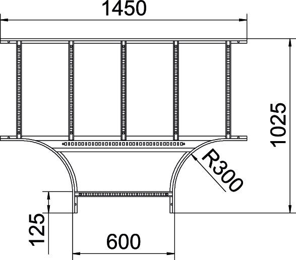 T-idom, vízszintes, hegesztett létrafokkal minden 60 mm oldalmagasságú kábellétrához.