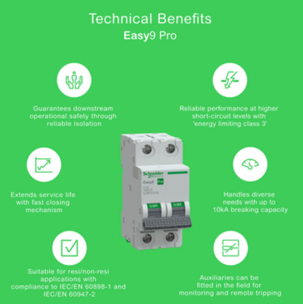 Az Easy9 Pro, az Easy9 család legújabb tagja, a legmagasabb szintű elektromos védelmet nyújtja, miközben megfelel a különböző projektek követelményeinek. Ideális lakossági környezetben, valamint kis- és közepes kereskedelmi épületekhez (pl. éttermek, gyógyszertárak, élelmiszerboltok, kiskereskedelmi üzletek).
