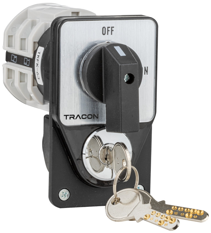 TRACON TKFK-63 Főkapcsoló, kulcsos, BE-KI (Kulcs 0-állásban vehető ki) 400V, 50Hz, 63A, 4P, 18,5kW, 64×122mm