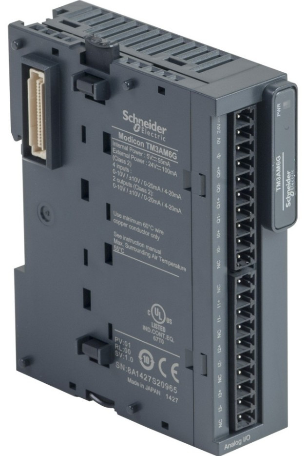 SCHNEIDER TM3AM6G Modicon TM3 bővítő modul, 4 analóg be- 2 kimenet, 12/11+1 bit, +/-10V / 0...10V / 0…20mA / 4…20mA, rugós