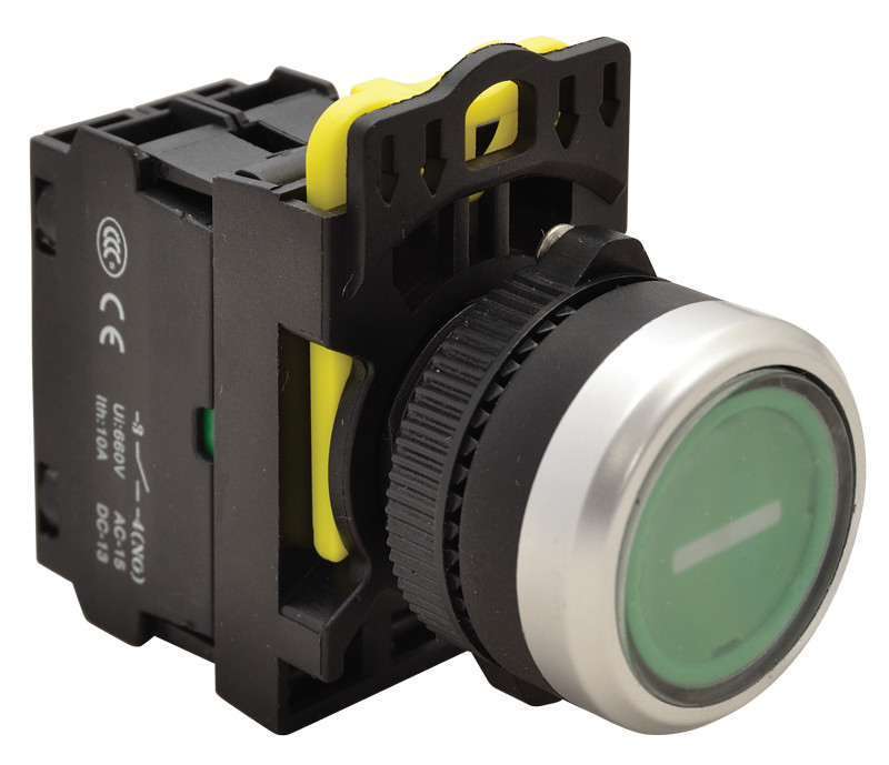 TRACON NYK3-P1L Jelölt, világító nyomókapcsoló, zöld, (fehér I) 1×NO, 5A/230V AC-15, IP65, LED 230V AC/DC