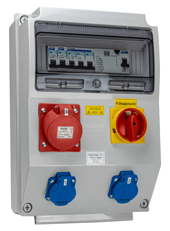 TRACON TDB15-12MVK Csatlakozó doboz védelemmel,főkapcs.,vezetékezett,készre sz. Prot.:RCCB,MCB,Out:2×SCHUKO+1×16A(3P+N+E)