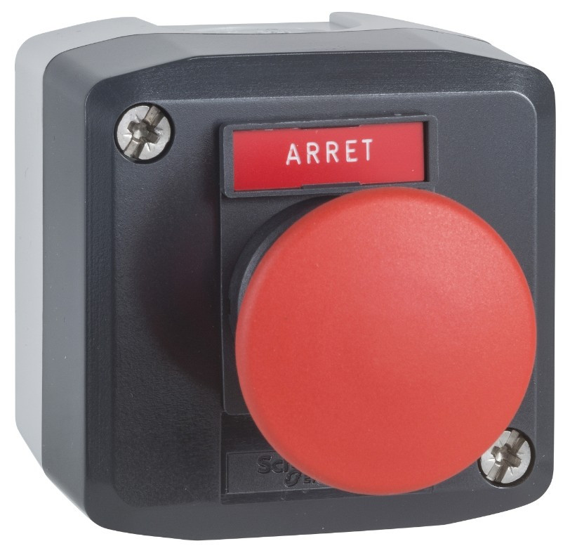Harmony XALD tokozott gombafejű nyomógomb, 1 piros visszatérő nyomógomb, 1NC, "Arrét" felirat