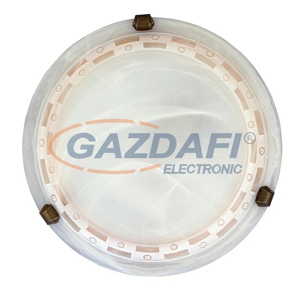 30 cm átmérőjű, mediterrán megjelenésű mennyezeti lámpa. Fém és műanyag szerkezettel vastag, mintás alabástromüveg lámpabúrával és bronz színű körmökkel. E27-es foglalatú, maximum 60W teljesítményű, halogén vagy LED fényforrással is használható.