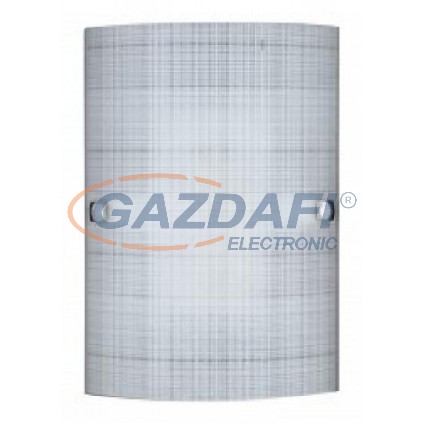 26 cm magas és 18 cm széles, időtlen stílusú fali lámpa. Fém szerkezet, vonalas mintájú, fehér domború kialakítású opálüveg lámpabúrával és króm színű díszcsavarokkal. E27-es foglalatú, maximum 60W teljesítményű, halogén vagy LED fényforrással is használható.