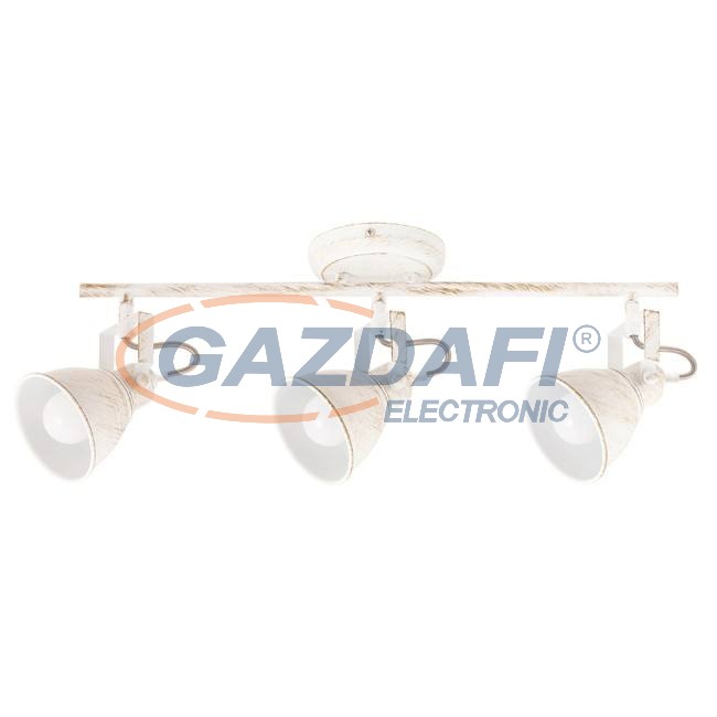 Vintage stílusú mennyezeti spotlámpa 3 db foglalattal. 52,5 cm széles, antik fehér színű fém lámpatest és pozícionálható lámpabúrák. A mennyezeti lámpa E-14-es foglalatú, max. 3x 40W teljesítményű energiatakarékos fényforrásokkal is használható.
