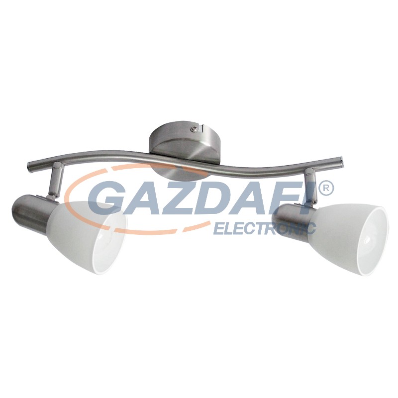 Időtlen stílusú spotlámpa, 2 darab foglalattal. 35 cm széles, szatin króm színű fém szerkezet és pozícionálható, fehér színű üvegbúrák, IP20-as védelemmel. A lámpatest E14-es foglalatú, max. 2x 40W teljesítményű, halogén vagy energiatakarékos fényforrásokkal is működtethető.