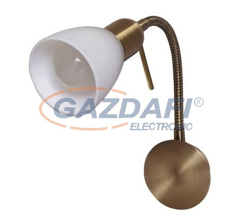 Időtlen stílusú fali spotlámpa 1 db foglalattal, hálózati vezetékkel, kapcsolóval és dugvillával. 20,5 cm magas, bronz színű fém szerkezet és gégecsővel pozícionálható lámpatest, fehér színű üveg búrával, IP20-as védelemmel. A lámpatest E-14-es foglalatú, max. 40W teljesítményű, halogén vagy energiatakarékos fényforrással is használható.
