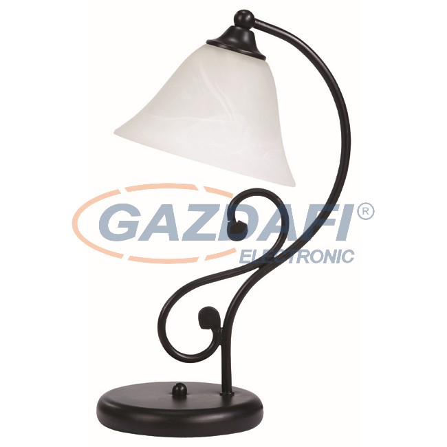 Klasszikus, egyben mediterrán stílusú éjjeli lámpa 38 cm magas, fekete színű, kovácsoltvas jellegű fém lámpatesttel, fehér alabástrom üvegbúrával. E14-es foglalatú, maximum 40W teljesítményű, halogén vagy LED fényforrással is használható.