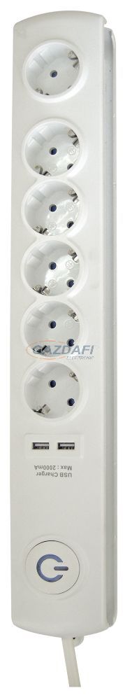 GAO 0398H Elosztó 6-os, talpkapcsolóval, 1,4m H05VV-F 3x1,5mm2 vezetékkel, 2xUSB töltővel, 2 USB töltő használata esetén max.2000mA általános leírása: