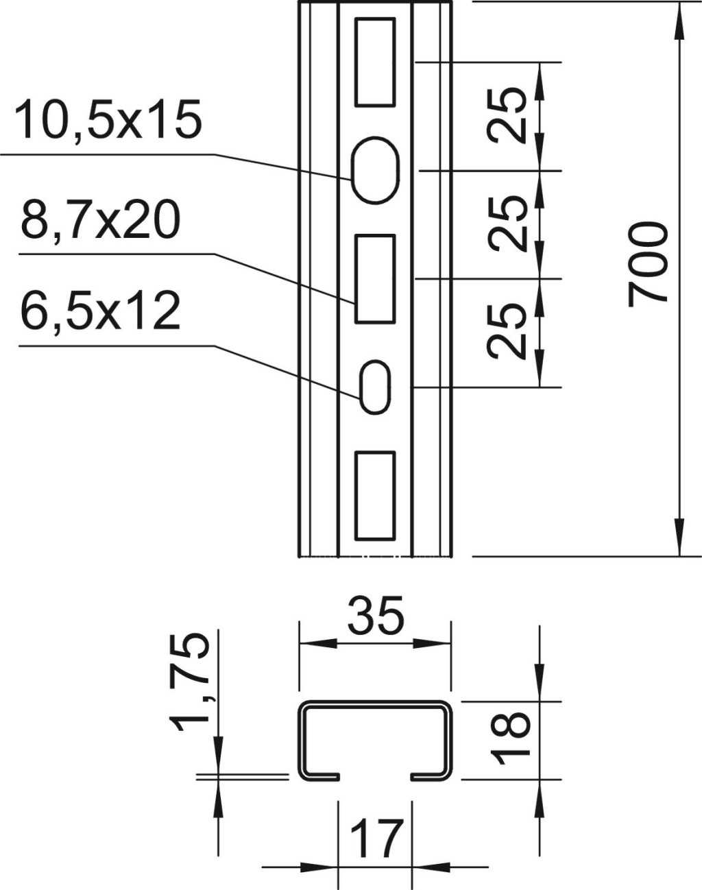 OBO 1104593 CMS3518P0700FT Profilsín CM3518, 17 mm résméret, 700mm merítetten tűzihorganyzott acél [FAD]
