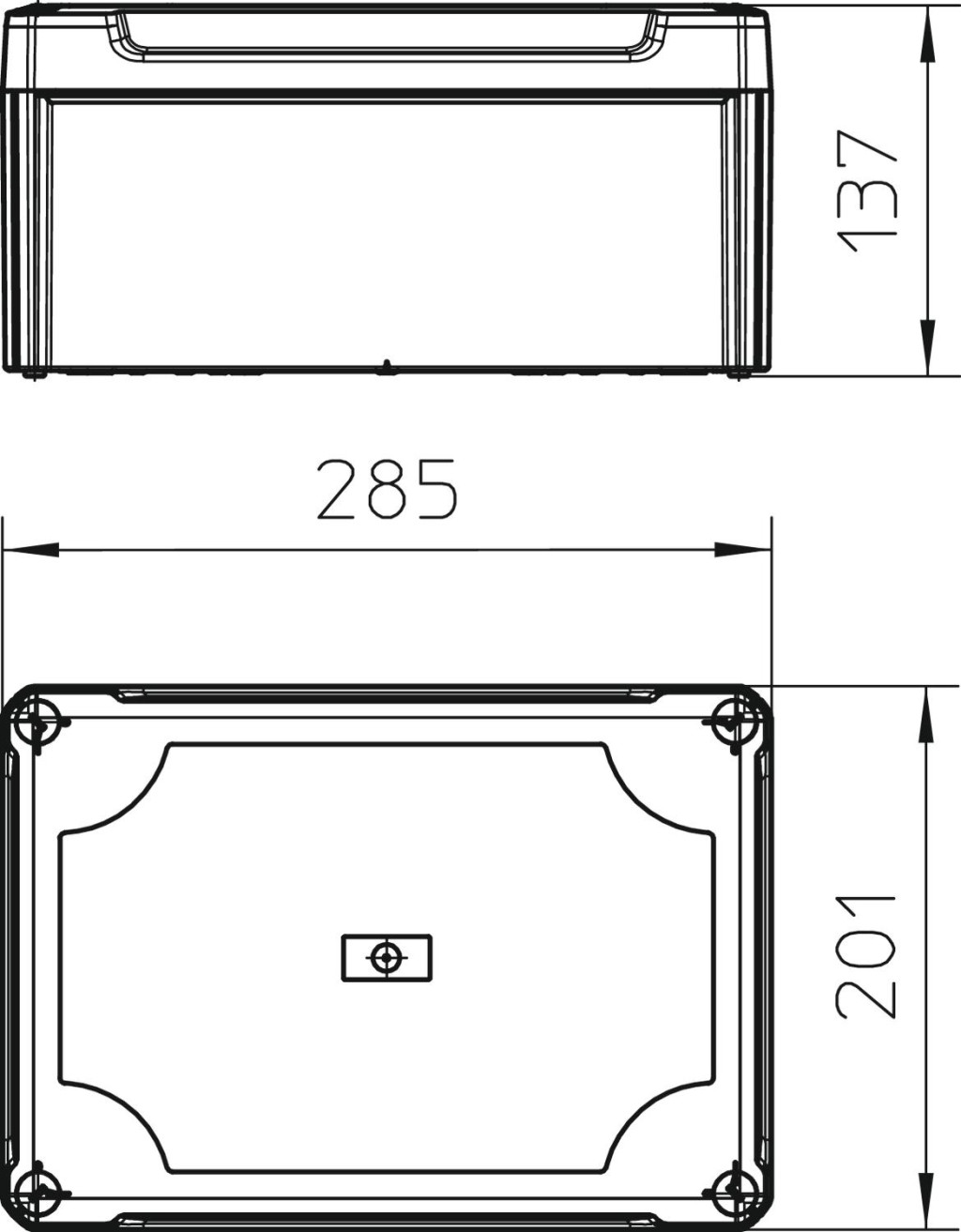 Zárt leágazódoboz a kábelek és vezetékek csatlakoztatásához beltéren és védett kültéri területeken. Téglalap alakú, bevezetések nélkül, merev oldalfallal. Alkalmas fali vagy mennyezeti szereléshez, szerelőlemezekre történő rögzítéshez. Lehetőség a belső rögzítésre és sarokdómon keresztül történő szerelésre. Magasított fedél, gyorszárral, plombálható. Halogénmentes és UV-álló anyagokból készült.