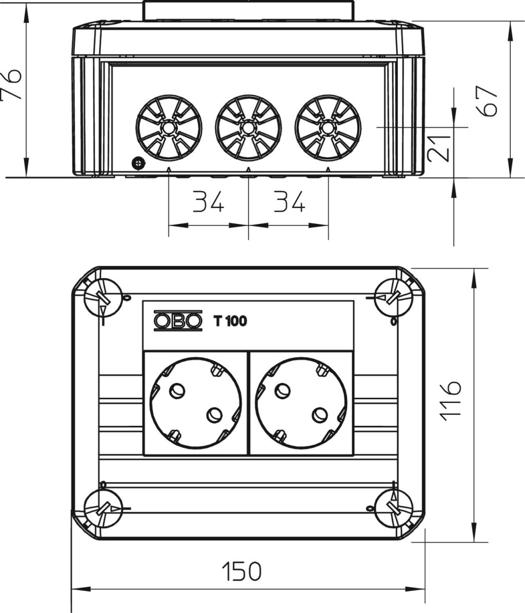 Az összes T-sorozatú leágazódoboz UV-álló. A leágazódobozok termoplasztikus polopropilénből készülnek és speciális húzásmentesítő bevezetőkkel vannak ellátva. Ezek a bevezetők közvetlenül a vezetékkel átlyukaszthatók. A nyílás különleges kialakítása révén a vezetékek véletlenül nem húzhatók ki. 7 - 21 mm kábelátmérőhöz alkalmas. A fedélben típustól függően 4 db fehér Modul 45 védőérintkezős csatlakozóaljzat található. A leágazódobozok 3,5 x 9,5 mm-es lemezcsavarok segítségével a fenéknyílásokon keresztül szerelőlapokra szerelhetőek. Plombálható fedél.