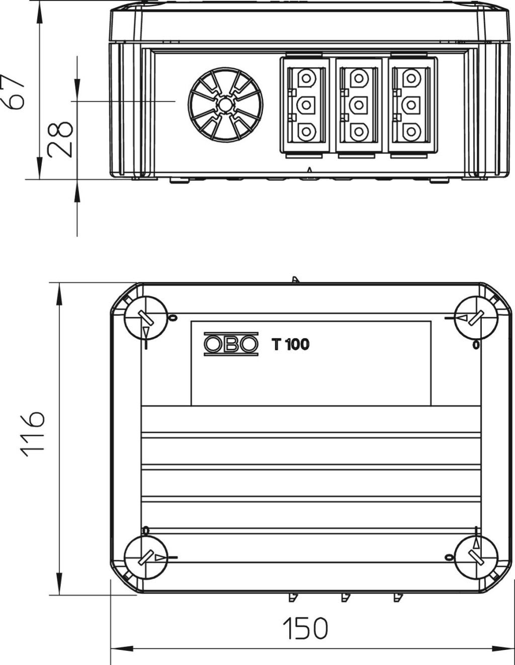 OBO 2007870 T100 WS 1S3 3S3A Leágazódoboz Wieland csatlakozóval 1S4+3B3 150x116x67mm polipropilén