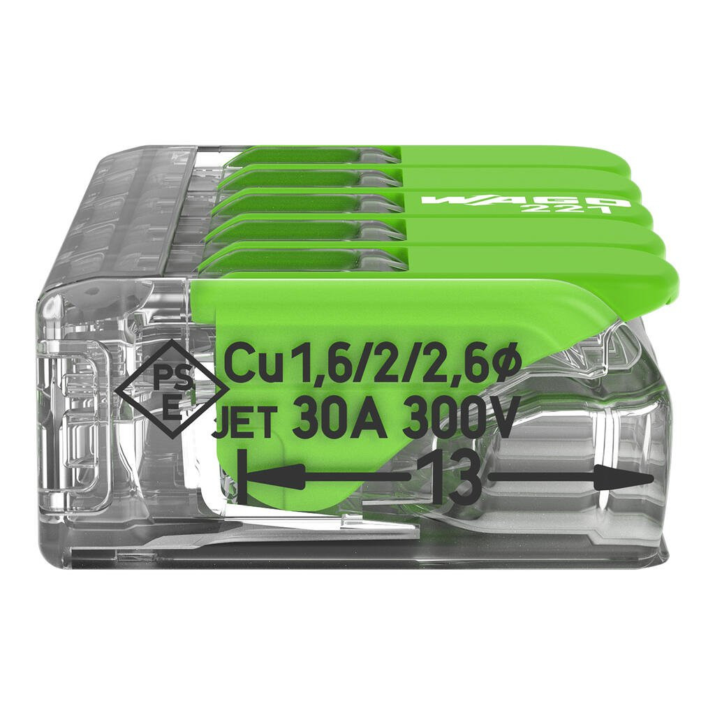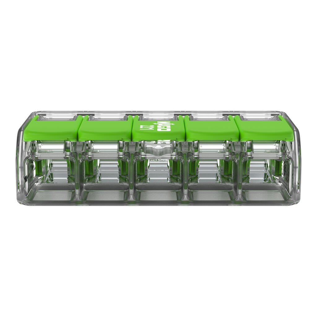 Wago 221-625 Vezeték összekötő rögzítő-leválasztókkal; minden vezetéktípushoz; max. 6 mm²; 5 vezeték; áttetsző készülékház;