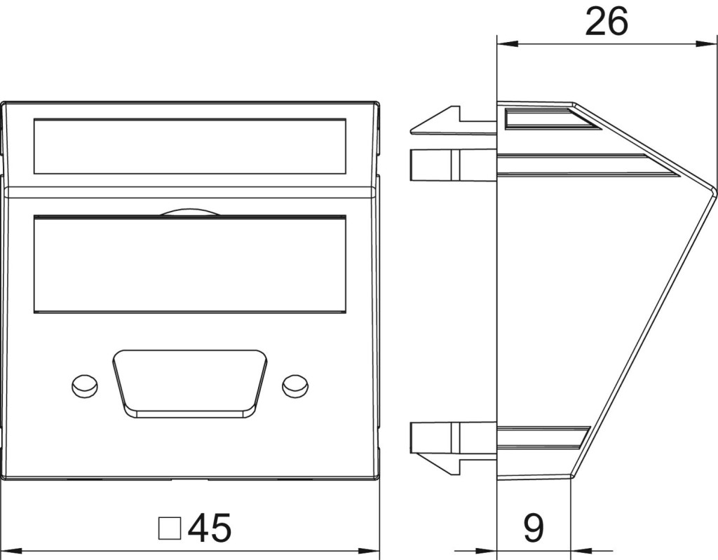 Multimédia tartó VGA / D-Sub9 csatlakozóhoz, ferde kivitel, felirati mezővel, csatlakozó nélkül. A bepattinható rögzítés normál és 90 fokkal elforgatott beépítést is lehetővé tesz.