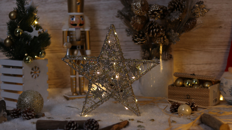 Tracon CHRSTGS14GWW LED karácsonyi csillag, arany,fém, elemes Timer 6+18h, 14LED, 3000K, 2xAA általános leírása:
