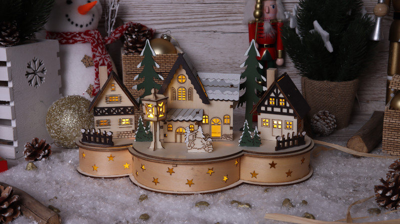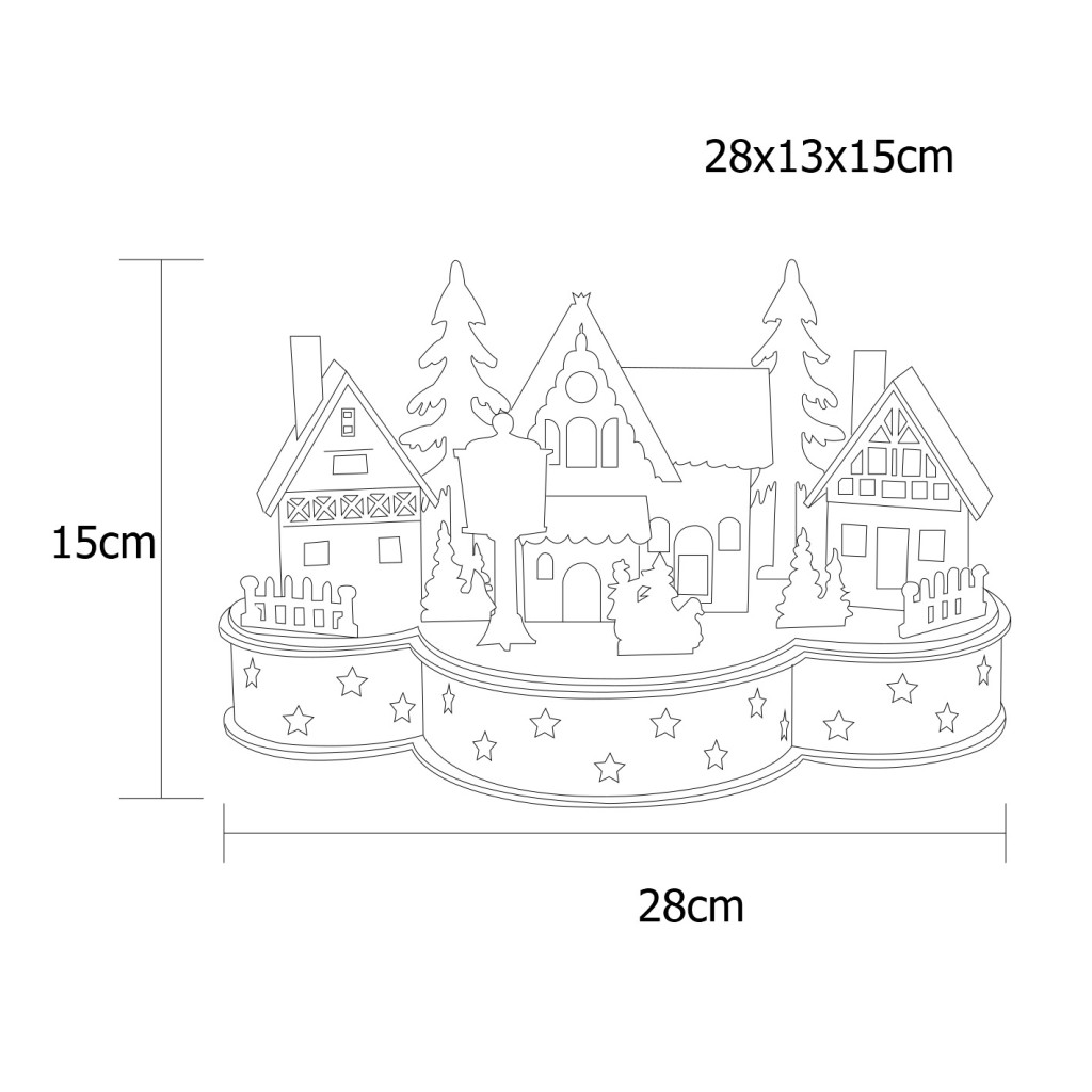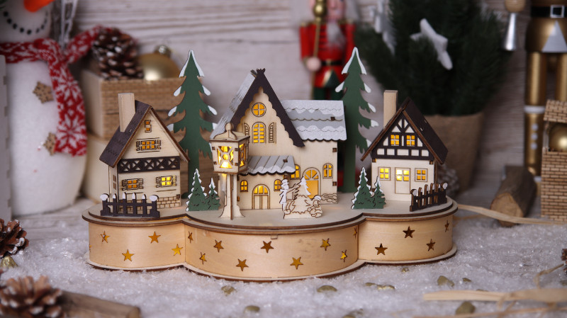 TRACON CHRWHVIL7WW LED karácsonyi falu, fa, elemes (X22083) Timer 6+18h,7LED, 3000K, 2xAA